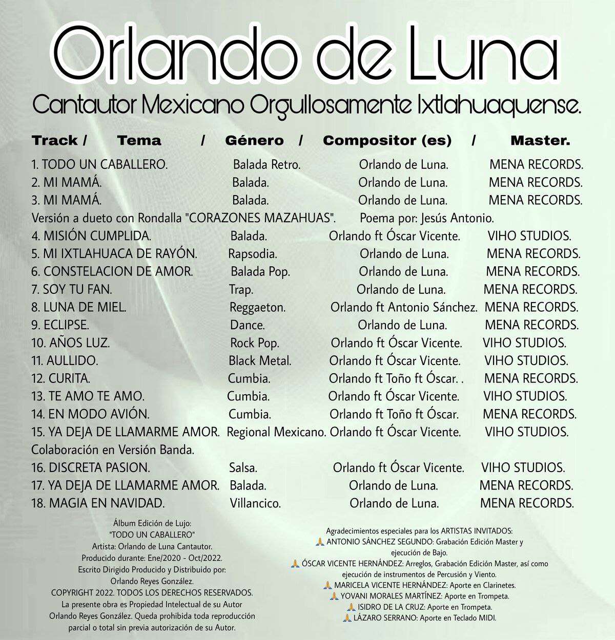 Como "Orlando de Luna" me he presentado en diversidad de escenarios, y ahora, les compartiré algunas de mis memorias, para que ustedes, puedan conocer un poco de la trayectoria, forjada durante 23 años; de los cuales, los últimos 7, han sido como CANTAUTOR, en 2018 publiqué mi primer albúm en vivo, y en 2019 en plataformas digitales y de streaming, siendo así, el primer CANTAUTOR oriundo del municipio de Ixtlahuaca Estado de México, que ha publicado obras originales en plataformas de Streamig. Sin más, les agradezco, formar parte de esta historia.